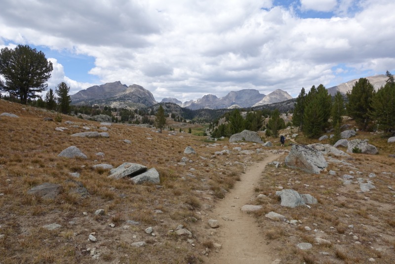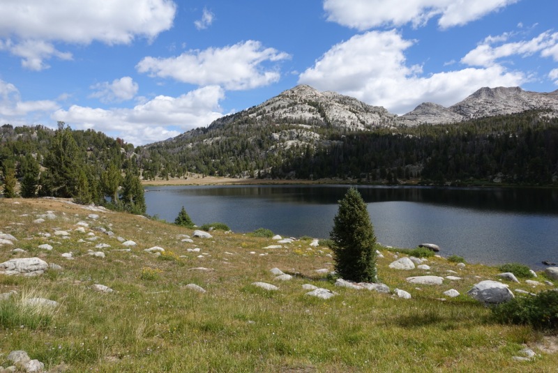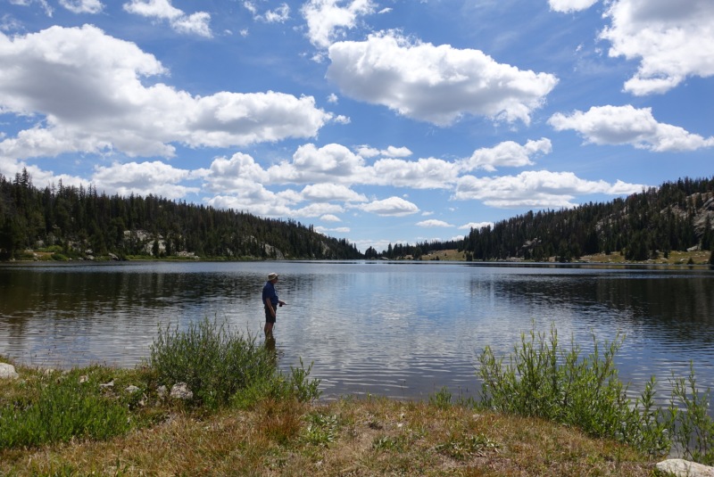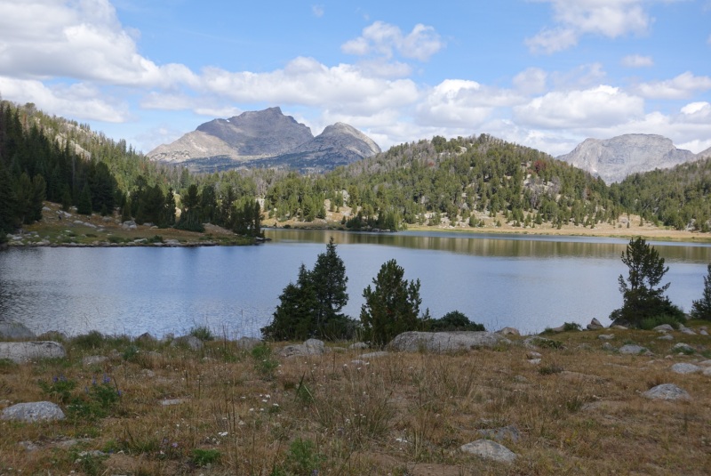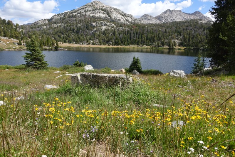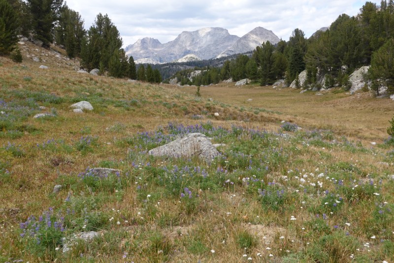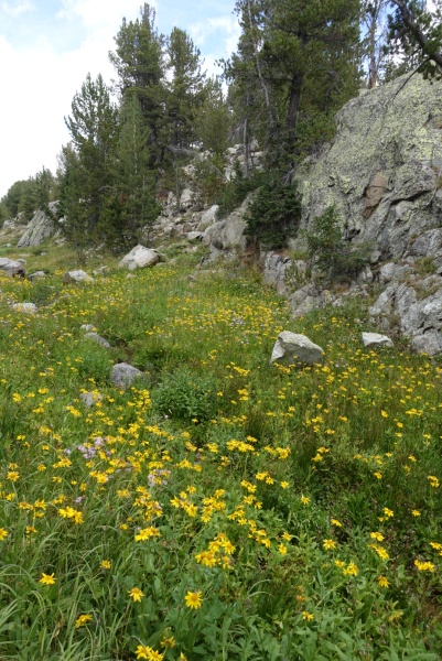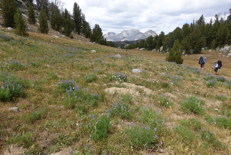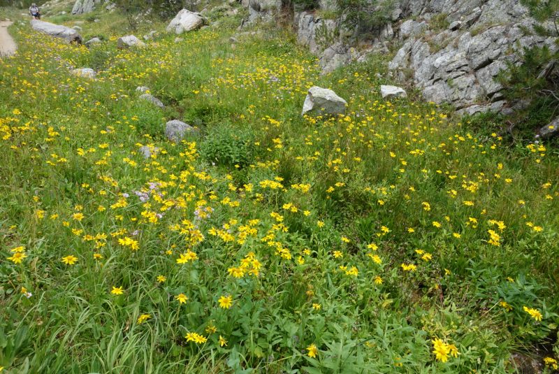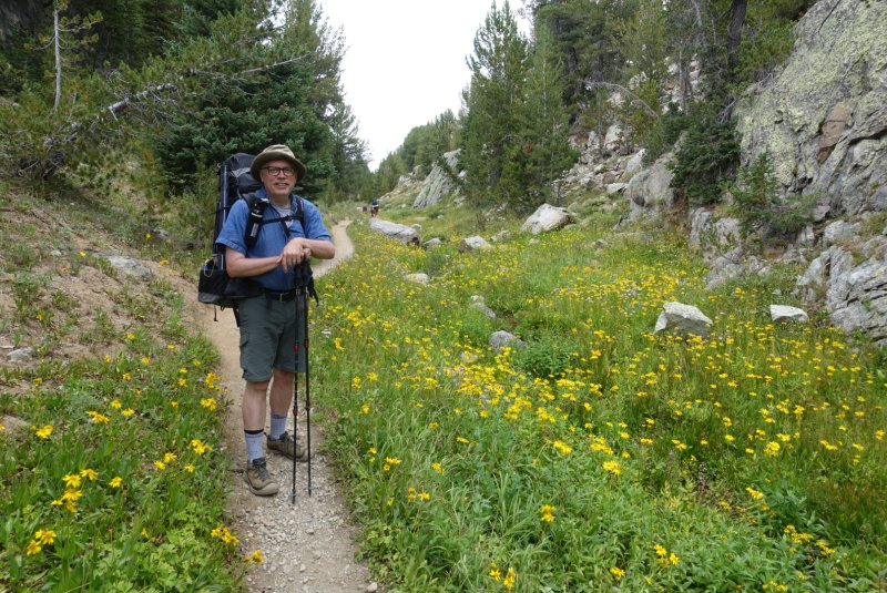 Roger in the densest wild flowers of the trip in the canyon draining in to Marms Lake
