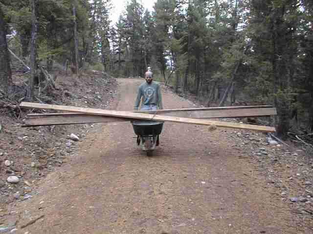 Neil bringing 2x6 sections down from our high ground storage.