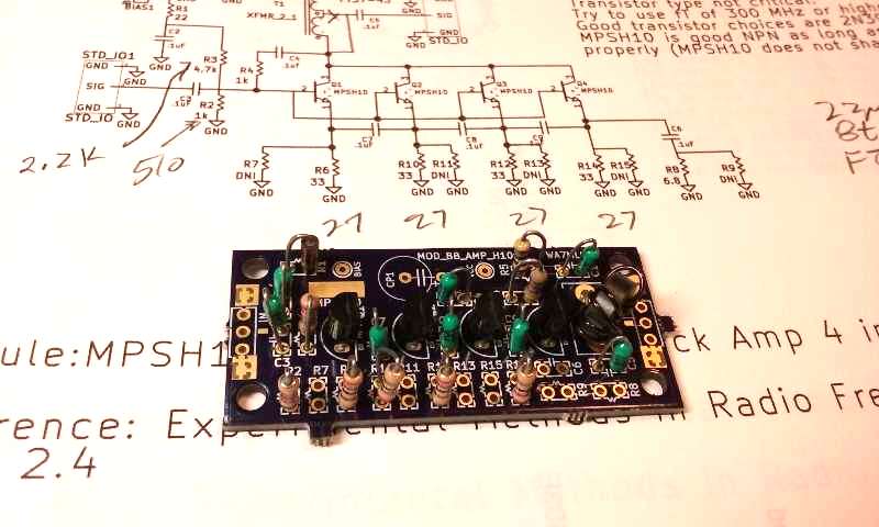 MPSH10s in this board work well out through 6m. Note that MPSH10 pin out is not the same as most NPN